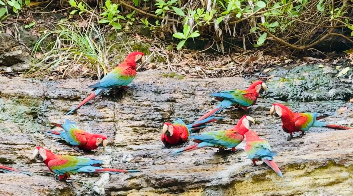 We began our hike deep into the Amazon until reaching the small hut that we would hide in for a few more hours until the Guacamayos landed across from us. It is in this spot that they come down to eat the sulfur which is what gives their feathers their bright colors.🌈